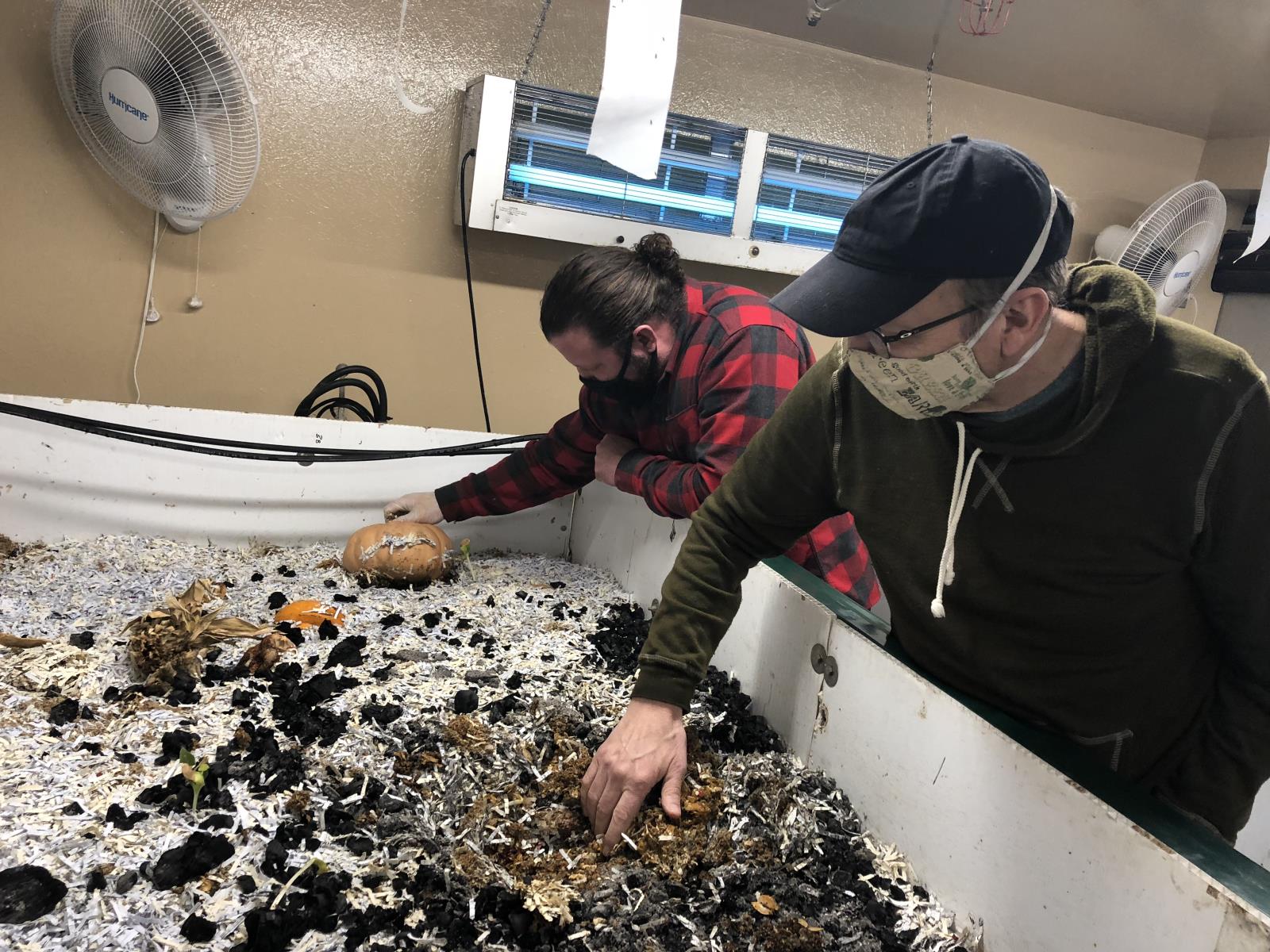 The worms, which are housed in two bins that are each eight feet long, four feet wide, and two feet deep, are fed vegetable scraps and other produce waste, as well as spent grains from a pilot beer brewery. They consume the waste and turn it into worm castings.